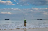 Visser op het strand van Jimbaran, Bali (Indonesië), met op de achtergrond twee vissersboten die hun vangst komen afleveren.