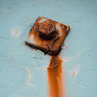 Een muuranker, geheel verroest en verweerd. De corrosie is bruin en oranje, samen met de lichtblauwe muur vormt het een rustige balans als een vlieger in de lucht.