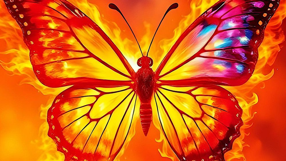 De achtergrond is donker gehouden, wat contrasteert met de felle kleuren van het vuur en de aandacht van de kijker vestigt op de majestueuze vorm van de vlinder. Het is alsof het vuur een verhaal vertelt - over transformatie, vrijheid en de schoonheid van de natuur.
