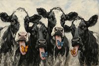 Dit schilderij met vier nieuwsgierige koeien die hun tong uitsteken met kleurrijke vlinders is een echte eyecatcher. De combinatie van de zwart-witte koeien en de felgekleurde vlinders zorgt voor een vrolijk en speels effect. Een uniek dieren schilderij dat perfect past in een landelijke keuken, woonkamer of boerderij-interieur.