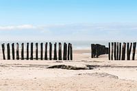 Een rij brandingbrekers op het strand van Wissant aan de prachtige Opaalkust van Noord-Frankrijk. Het zachte gouden zand en de kalme zee zorgen samen voor de rustige schoonheid van de Franse kustlijn. Een prachtig kustlandschap om uw woonruimte op te fleuren en u aan de zomer te herinneren.