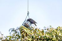 De spreeuw opent zijn snavel wijd om de voedselbal mee te nemen.