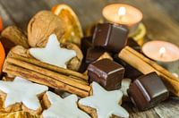 De vormkoekjes van de Kerstmisster, chocolade, noten, kaneel en kaarsen op houten lijst