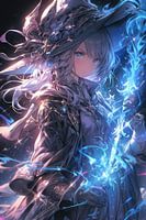 Een mystieke tovenares gekleed in ingewikkelde donkere gewaden en een breedgerande hoed. Ze hanteert een gloeiend, etherisch zwaard van blauwe vlammen. Haar zilveren haar en doordringende blauwe ogen weerspiegelen een koude, magische intensiteit te midden van een vlaag van fonkelende magische sintels.