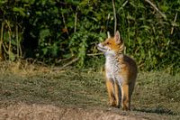 Een juvenile vos (Vulpes vulpes) volgt aandachtig de bewegingen van een dagpauwoog (Inachis io)