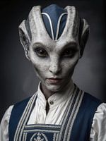 Dit portret toont een figuur die de blik van de kijker zonder enige verdediging tegemoet treedt. Het gezicht is vreemd in zijn anatomie en tegelijkertijd vertrouwd in zijn uitdrukking. De grote, donkere ogen lijken kalm, oplettend en alert. Ze observeren niet, ze onderzoeken. De fijne lijnen van de huid doen meer denken aan organisch…