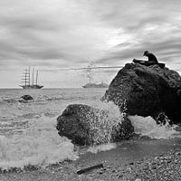 Een ongelooflijk gelukkig moment dat het plezier van vissen, golven, een pittoresk zeilschip en het passerende passagiersschip op de achtergrond combineert tot een ontroerend, dynamisch, licht poëtisch natuurmotief.
