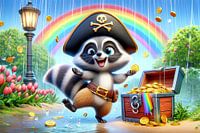 In deze vrolijke scène zien we een dolgelukkige wasbeer gekleed in een klassieke piratenoutfit met een versierde hoed met een schedel en gekruiste botten. Hij danst uitbundig op een nat pad, net alsof hij de grootste schat heeft gevonden. In feite heeft hij dat ook: een oude houten kist, beveiligd met een groot slot, vol glimmende gouden munten die om hem heen omhoog schieten en in plassen plonsen, wat voor spetterend plezier zorgt. De achtergrond is een kleurrijk landschap waarin na een regenbui een prachtige regenboog langs de heldere hemel strijkt. Alles in deze foto bruist van vitaliteit, van de pas verregende tulpen aan de rand tot de kleine waterdruppeltjes die van de munten druipen. De combinatie van licht en kleur creëert een sfeer vol magie en avontuur. In deze wondere wereld lijkt alles mogelijk - zelfs voor een wasbeerpiraat om een regenboogschat te vinden.