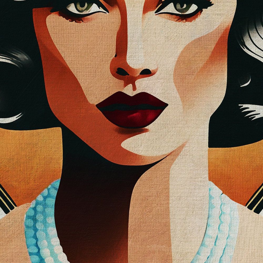Dit portret van een vrouw is gemaakt in de decoratieve stijl "Art Deco" met typische horizontale en zigzaglijnen. Het kleurenpalet is sober maar kleurrijk.