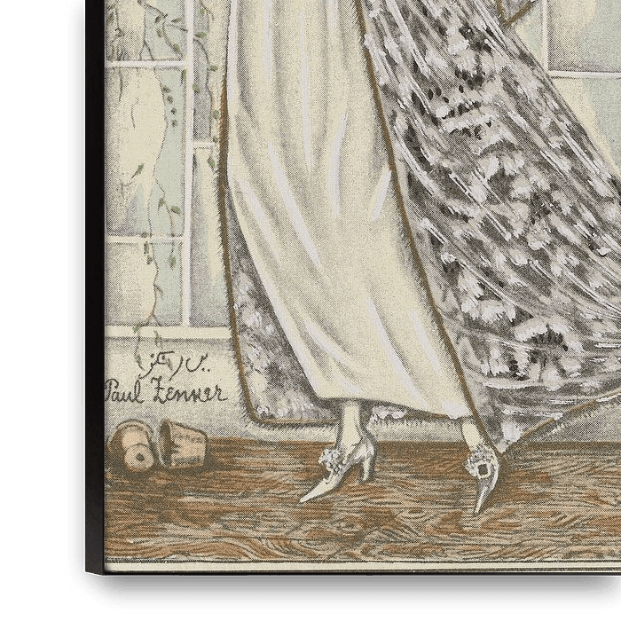 Een historische mode prent in een modern jasje: “faux”. Geïnspireerd door de Art Deco, een stijlbeweging die opkwam in de jaren twintig van de vorige eeuw. Nieuw zakelijkheid gemengd met moderne strakke lijnen en kleuren.