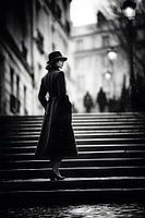 De zwart-wit foto toont een vrouw op een natte trap in Parijs. Ze draagt een lange jas en een elegante hoed, haar silhouet steekt scherp af tegen de achtergrond. Sneeuwvlokken vallen zachtjes door het tafereel. Op de achtergrond zijn de gevels van huizen en lantaarns wazig, terwijl enkele schimmige figuren in de nevel te herkennen zijn.