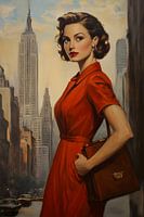 Het schilderij toont een vrouw in een elegante rode jurk ontworpen volgens de typische mode van de jaren 1950. Ze staat op een straathoek en haar houding straalt zowel gratie als een subtiele eenzaamheid uit. Haar blik is peinzend en lijkt in de verte te dwalen terwijl ze de levendige stad om haar heen in zich opneemt.