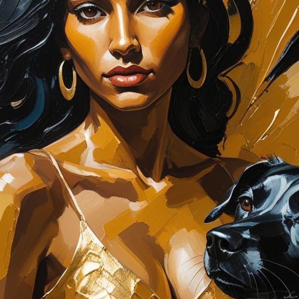 Het schilderij toont een abstracte voorstelling van een vrouw in een betoverende combinatie van goud en zwart. De kunstenaar is erin geslaagd om de elegantie en het mysterie van de figuur te benadrukken door het gebruik van krachtige goudtinten en diepzwart. De vormen en lijnen vloeien in elkaar over en creëren een gevoel van beweging en diepte. De gouden accenten geven het werk een vleugje luxe en grandeur, terwijl de donkere tinten een mystieke sfeer creëren. Dit kunstwerk betovert de kijker en nodigt uit om de verborgen symboliek en emoties van de afbeelding te verkennen.