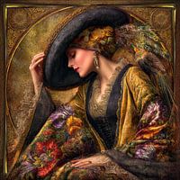 Op haar hoofd draagt ze een grote, opvallende hoed die de glamour en flamboyante van het art deco-tijdperk benadrukt. De stijl van het stuk is duidelijk geïnspireerd door de art deco-beweging, met strakke lijnen, geometrische vormen en een gevoel van luxe en glamour dat kenmerkend is voor die periode: the Roaring Twenties.