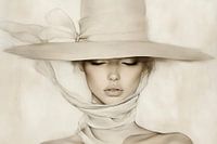 De vrouw met de hoed. Modern portret in neutrale kleurtinten. Een bijzondere blikvanger voor je interieur! Exclusief verkrijgbaar bij Werk aan de Muur.