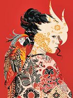 Er zijn veel afbeeldingen van vrouwen met een vogel, papegaai of kaketoe. Het is het decoratieve aspect dat kunstenaars altijd fascineert. Hier gaat het motief volledig op in de decoratie: Het draait allemaal om kleuren, vormen en patronen. Als je ervan houdt, is dit een unieke poster voor je woonkamer.