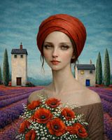 Tussen lavendelvelden en witte huizen houdt ze haar onuitgesproken liefdes. Ze houdt rode klaprozen tegen haar borst als woorden die in de lucht blijven hangen. In de stilte van de avond houdt iemand nog steeds van haar — zonder het ooit te hebben gezegd.