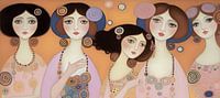 Dit werk toont een groep van vijf gestileerde vrouwenfiguren, die zij aan zij staan tegen een warme, oranjeroze achtergrond. Hun gezichten zijn sereen, met grote, expressieve ogen, porseleinachtige huid en rode lippen. Hun houdingen en blikken suggereren verbondenheid, tederheid en introspectie.
