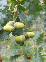 De vruchten van een eikenboom. In de herfst is het bos een grote schatkamer en zijn er volop, eikels, kastanjes en beukennootjes te vinden. Aan deze eikenboom hangen allerlei groene trosjes eikels.