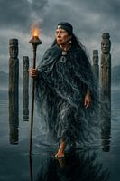 Een vrouw stapt blootsvoets over spiegelglad water - kalm, vastberaden, alsof ze op de huid van de wereld loopt. Haar mantel lijkt gesponnen uit mist, een levende sluier van rook en herinnering. In haar rechterhand draagt ze een fakkel waarvan de vlam niet alleen licht uitstraalt, maar ook geschiedenis.