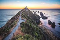 Het gouden uur bij Nugget Point betovert het kustlandschap. Het avondlicht baadt de rotsachtige kliffen en de oceaan in een warme, gouden gloed, terwijl de lucht oplicht in delicate kleuren. De stemming is vredig en magisch en het landschap wordt gekenmerkt door de intense schoonheid van de natuur. Dit uitzicht toont de adembenemende elegantie van Nugget Point tijdens het gouden uur.