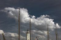 De witte vuurtoren van de Friese zeehaven van Harlingen met een klassieke wolkenlucht en gezien door enkele grote masten van schepen die in de haven liggen.
