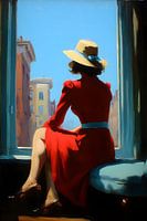 Een vrouw in een felrode jurk zit op een beklede vensterbank. Ze draagt een lichte zomerhoed met een blauwe band. Haar rug is naar de toeschouwer gekeerd, haar blik is gericht op een lichte, bijna verlaten straat met eenvoudige herenhuizen onder een heldere hemel. Het zonlicht tekent haar silhouet scherp af tegen het koele blauw van het…