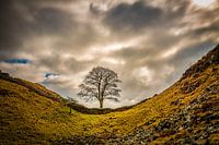 De foto toont een eenzame, kale boom op een heuvelachtig landschap (Hadrian’s Wall in het VK). De boom staat centraal, omringd door glooiende grasheuvels met stenen en ruïnes, onder een bewolkte hemel met diffuus licht. De kale boom fungeert als een symbool van eenzaamheid en veerkracht, wat wordt versterkt door de leegte van de omgeving. Het licht en de bewolking creëren een serene en reflectieve sfeer. De afbeelding vertelt een verhaal van isolatie en harmonie, waar de natuur en de ruïnes de vergankelijkheid van de mens en de kracht van de natuur weerspiegelen. In september 2023 werd de iconische Sycamore Gap boom, illegaal geveld in een duidelijke daad van vandalisme. De boom, een geliefd natuurmonument en populaire toeristische attractie, werd 's nachts omgehakt, wat leidde tot wijdverspreide verontwaardiging.
