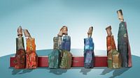 Foto van een driedimensionaal object uitgevoerd in afvalkarton van verpakkingen. Afgebeeld zijn mensen, in geabstraheerde vorm die in tweetallen in gesprek zijn. Opvallend daarbij is de behoefte aan persoonlijke ruimte die ervoor zorgt dat er gekozen is voor maximale ruimte tussen de figuren, die elkaar blijkbaar niet kennen. De blauwe…