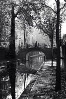 De wandelaar op de Magdalenabrug over de Nieuwegracht in Utrecht (zwartwit). Deze foto werd op 7 november 2025 gemaakt door de Utrechtse fotograaf André Blom in het kader van zijn al meer dan tien jaar lopende foto project 'De Utrechtse Grachten'.