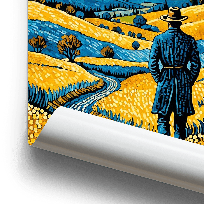 A.I. kunstwerk van een man die door een landschap wandelt met bergen en bloemen velden. De stijl is gemaakt met een knipoog naar de werken van Van Gogh.