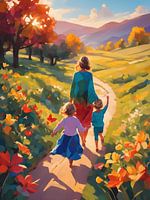 Dit abstracte schilderij vangt een intiem moment dat tegelijk universeel aanvoelt: een moeder die met haar kinderen door een zomers natuurgebied loopt. We zien hen van achteren, niet om afstand te creëren, maar juist om ruimte te laten voor herkenning. De toeschouwer kijkt mee, loopt als het ware met hen mee, een gedeeld moment op een…