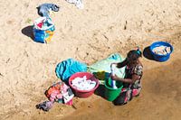Vrouw in Madagascar doet de was aan de rivier, gezien vanaf boven