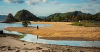 Aan het strand van Kuta, Lombok, eiland van Indonesië. Moeder met kind loopt over het strand bij zonsondergang. Blauwe zee reflecteert het heuvelachtig landschap. Panorama, reis en landschapsfotografie.