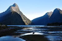 Het kalme water van Milford Sound weerspiegelt de majestueuze omringende bergen en creëert een symmetrisch landschap waar de natuur oneindig lijkt. De rust van deze plek wordt alleen verstoord door de verre roep van een zeevogel.