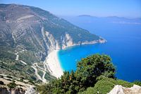 De kronkelige weg naar Myrtos Beach op Kefalonia, Griekenland. Veel mensen zien dit als het mooiste strand ooit, maar in werkelijkheid is het behoorlijk afschuwelijk. Het bestaat voornamelijk uit rotsen met nauwelijks zand en het is er behoorlijk druk. Maar het ziet er zeker mooi uit van bovenaf.