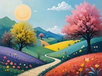 Een idyllisch pad dat door een fris, groen landschap slingert en de aankomende lente aankondigt.