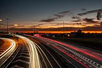 Door de lichten van de auto's en de zonsondergang.