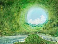 Het schilderij neemt de kijker mee op een fascinerende reis naar een mysterieuze wereld. We staan bij de uitgang van een enorme tunnel en kijken in het heldere landschap dat in het daglicht voor ons ligt. De wanden van de tunnel zijn begroeid met weelderige grassen die zich vastklampen aan de onzichtbare grond eronder en een natuurlijke…