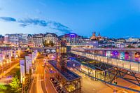 De Place de l'Europe in de wijk Le Flon van Lausanne in de avond, kanton Vaud, Zwitserland.