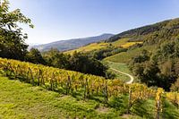 De wijngaarden tussen Turckheim en Ingersheim in de Franse Elzas (3). In de zuidelijke Elzas op de hellingen van de uitlopers van de Vogezen vind je zover het oog kan zien wijngaarden. Heel veel wijngaarden. In de herfst (deze foto is gemaakt op 12 oktober 2025) begint het blad aan de ranken al te verkleuren, wat door de prachtige belichting van de zon nog eens extra benadrukt wordt.