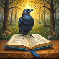 Een majestueuze kraai staat op een open boek, verlicht door stralend, gouden licht dat door een weelderig, betoverd bos valt. Gloeiende bloemen omringen het tafereel en voegen een vleugje speelsheid en magie toe aan de sfeer.