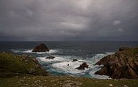 Woeste golven slaan tegen de kliffen aan de Atlantische kust bij Erris Head in county Mayo in Ierland. Er kan een spectaculaire rondwandeling worden gedaan over de kliffen. Donkere regenwolken pakken samen.