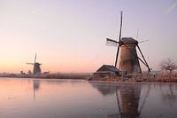 De zachte kleuren van een zonsopkomst met twee molens gezien vanaf het ijs van de bevroren vaart tijdens een hele koude morgen in de winter in Kinderdijk, Nederland.