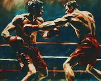 Het schilderij legt een levendige en opwindende bokswedstrijd vast, gedomineerd door een opvallend kleurenpalet van rood en zwart. Op de voorgrond zijn twee boksers verwikkeld in een intense strijd, waarbij hun felrode handschoenen in schril contrast staan met de donkere, dreigende achtergrond. Dit kleurenspel symboliseert zowel de…