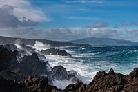 De woeste vulkanische rotskust van het eiland Pico met op de achtergrond het eiland Faial. Hoge golven vanaf de atlantische oceaan slaan er op stuk.