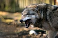 Een Europese wolf, met de hand grootgebracht en gewend aan mensen, maar zelfs als er voedsel is, begrijpt hij het niet leuk. Indrukwekkende dieren, vol magie, mystiek en schoonheid