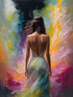 Ontdek het mysterie en de betovering in dit prachtige schilderij dat een vrouw in al haar gracieuze eenvoud vastlegt. In dit digitale meesterwerk, gecreëerd met de rijke textuur van olieverf en een in pasto techniek, ziet u een vrouw van achteren, haar elegante jurk schitterend in een spel van felle kleuren, en haar haren wapperend in de wind. Het kleurrijke spektakel waarin diverse tinten harmonieus samensmelten, geeft het schilderij een bijna magische uitstraling. Elke kleur, zorgvuldig gekozen en perfect gemengd, draagt bij aan het mysterie dat dit kunstwerk uitstraalt. Laat uzelf meevoeren door de levendige tinten en de serene schoonheid van dit minimalistische portret. Een waar juweel voor iemand die houdt van moderne interpretaties en klassieke verfijning. Mis deze kans niet om dit bijzondere schilderij aan uw collectie toe te voegen!