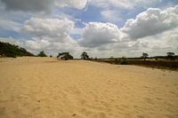 De Loonse en Drunense duinen met een boom in het zonlicht. Op de achtergrond mooie Nederlandse luchten met wolken waar het zonlicht doorheem straalt. Het gele zand in de duinen is een mooi contrast met de groen bomen