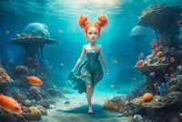 Een lief klein zeemeisje, zij leeft op de bodem van de zee, tussen het prachtige kleurige koraal en de kleurige vissen. Zij leeft als een zeemeermin, de zeebodem is haar thuis. Haar fel oranje haar draagt zij in twee knotten en haar jurk deint mee met de golven. Het beeld is met behulp van ai gegenereerd.